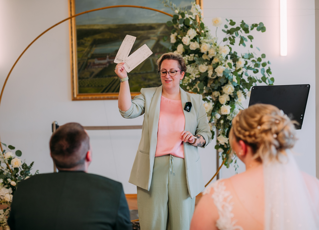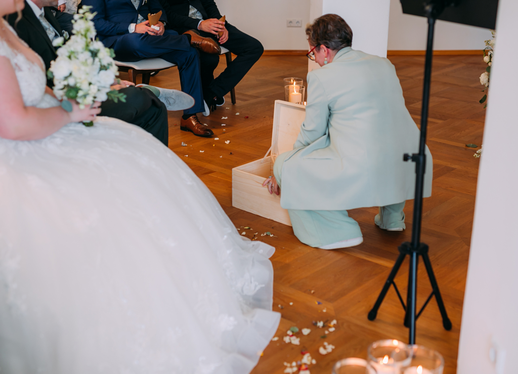 Besonders berührend waren die beiden Rituale, die wir in die Zeremonie eingebunden haben. Zum einen die Erinnerungsbox, in der N & A ihre gemeinsame Geschichte noch einmal Revue passieren ließen: das Kennenlernen, das Verlieben, die kleinen und großen Momente, die sie genau hierher geführt haben. Ein stiller, sehr emotionaler Rückblick auf ihre gemeinsame Reise.