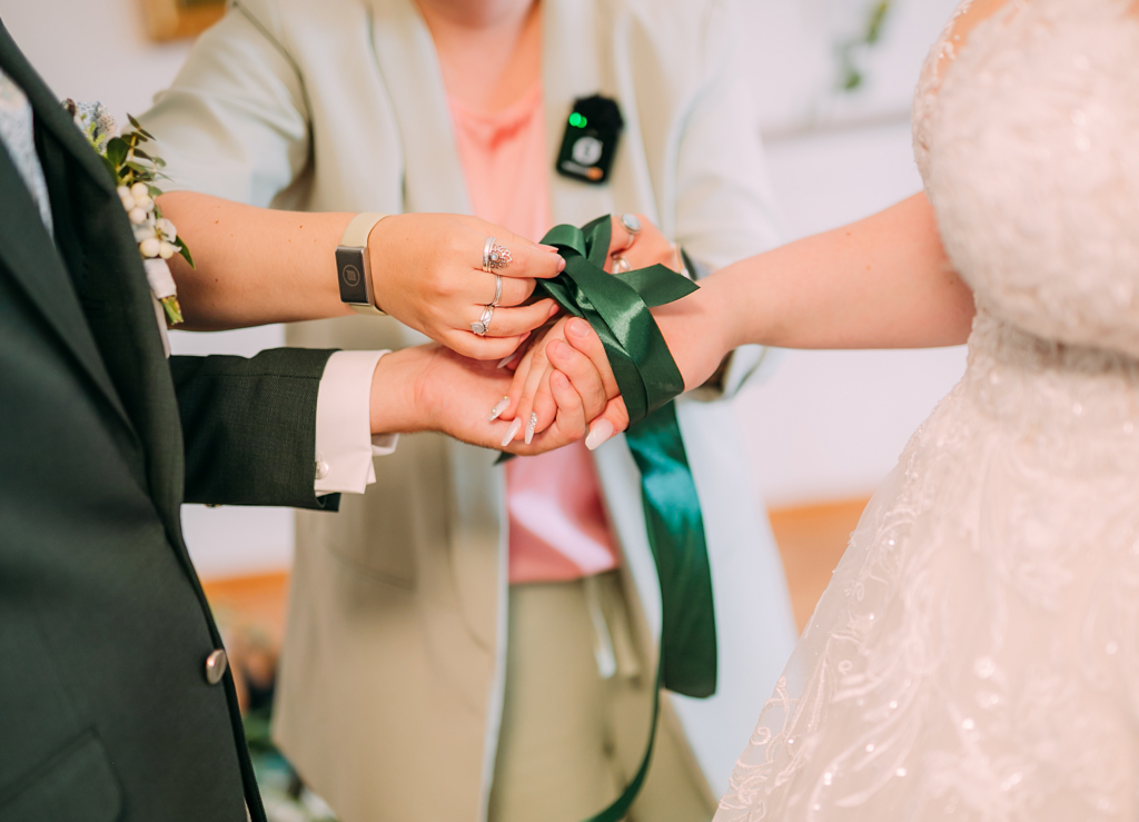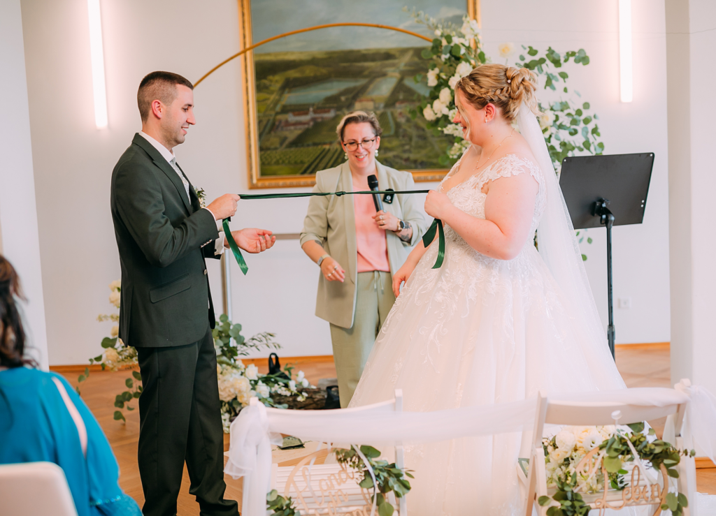 Zum anderen das Handfasting-Ritual, das für mich persönlich immer etwas ganz Besonderes ist. Das symbolische Binden der Hände steht für den Knoten der Liebe – für Verbundenheit, Vertrauen und das bewusste Ja zueinander. Gerade in diesem Moment war die Tiefe zwischen den beiden deutlich spürbar.